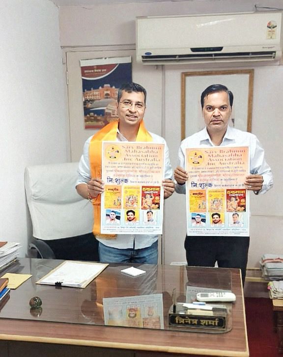 सर्व ब्राह्मण महासभा.INC ऑस्ट्रेलिया ने एक विशेष अभियान “हर घर गीता” की शुरुआत की है। संस्था प्रमुख रवि शर्मा ने बताया इस पहल के तहत ऑस्ट्रेलिया में रहने वाले प्रत्येक सनातनी परिवार तक श्रीमद्भगवद गीता, रामचरितमानस, हनुमान चालीसा एवं अन्य धार्मिक ग्रंथ निःशुल्क पहुँचाने की बनाई गई है। इस संदर्भ में राजस्थान प्रभारी विनोद शर्मा के संयोजन में पोस्टर विमोचन सुरेश मिश्रा, सुनील उदय, बालमुकुंद आचार्य, गोपाल शर्मा, महेश शर्मा जी (पूर्व राज्य मंत्री विप्र कल्याण बोर्ड राजस्थान) , महाराज सुरेश चंद्र, रिनेंद्र शर्मा, लक्ष्मण (रिटायर्ड आईजी ), हरिप्रसाद शर्मा( रिटायर्ड आईजी राजस्थान), अनिल पालीवाल (आईपीएस डीजीपी यातायात राजस्थान) द्वारा किया गया
